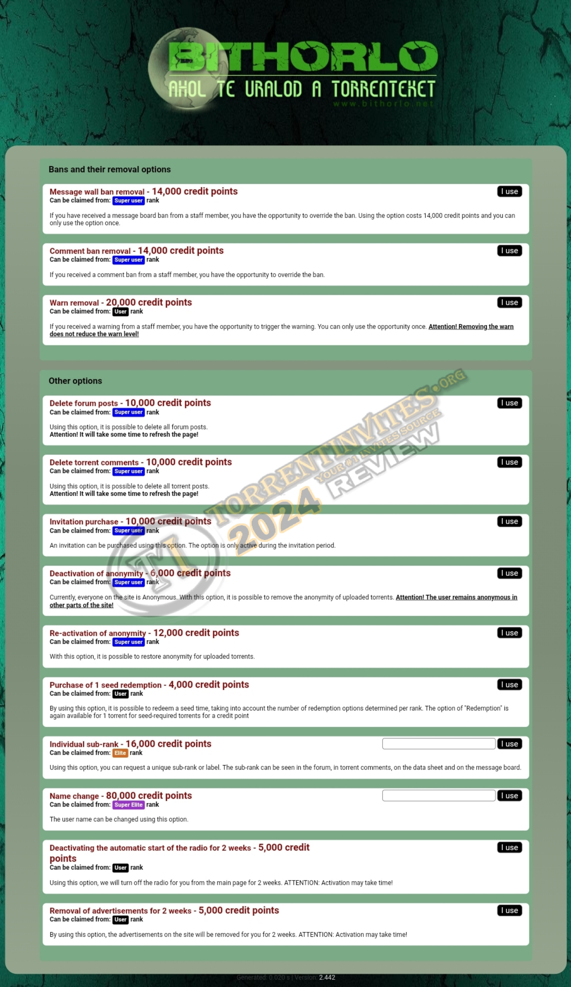 - Bonus System is available, You can buy Invites, Anonymity on the tracker, you can remove the Ads, remove warnings, remove the Radio playing automatically, etc. through the bonus points.