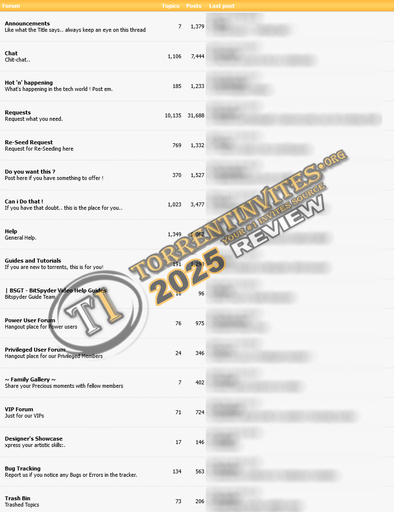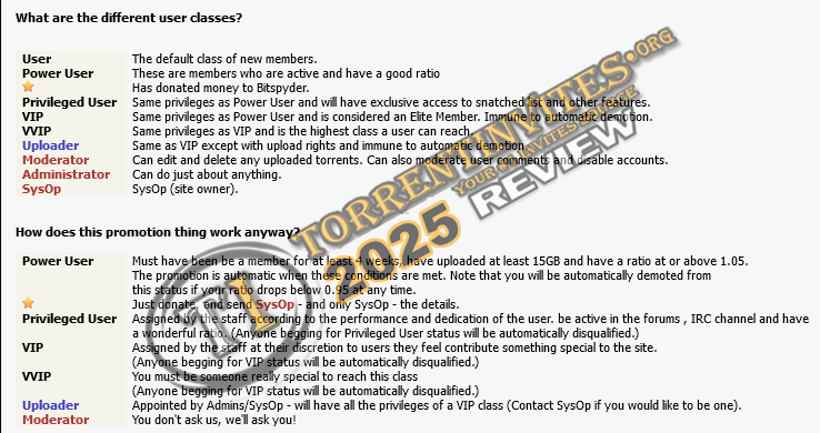 Members can make use of the shoutbox located on the homepage or their IRC channel. Bitspyder does have a forums section but this seems to be very quiet and rarely used. All members are required to seed back anything they download to a 1:1 ratio, members with a low ratio will receive a warning for six days before their account is disabled and IP is banned if no improvement has been made.