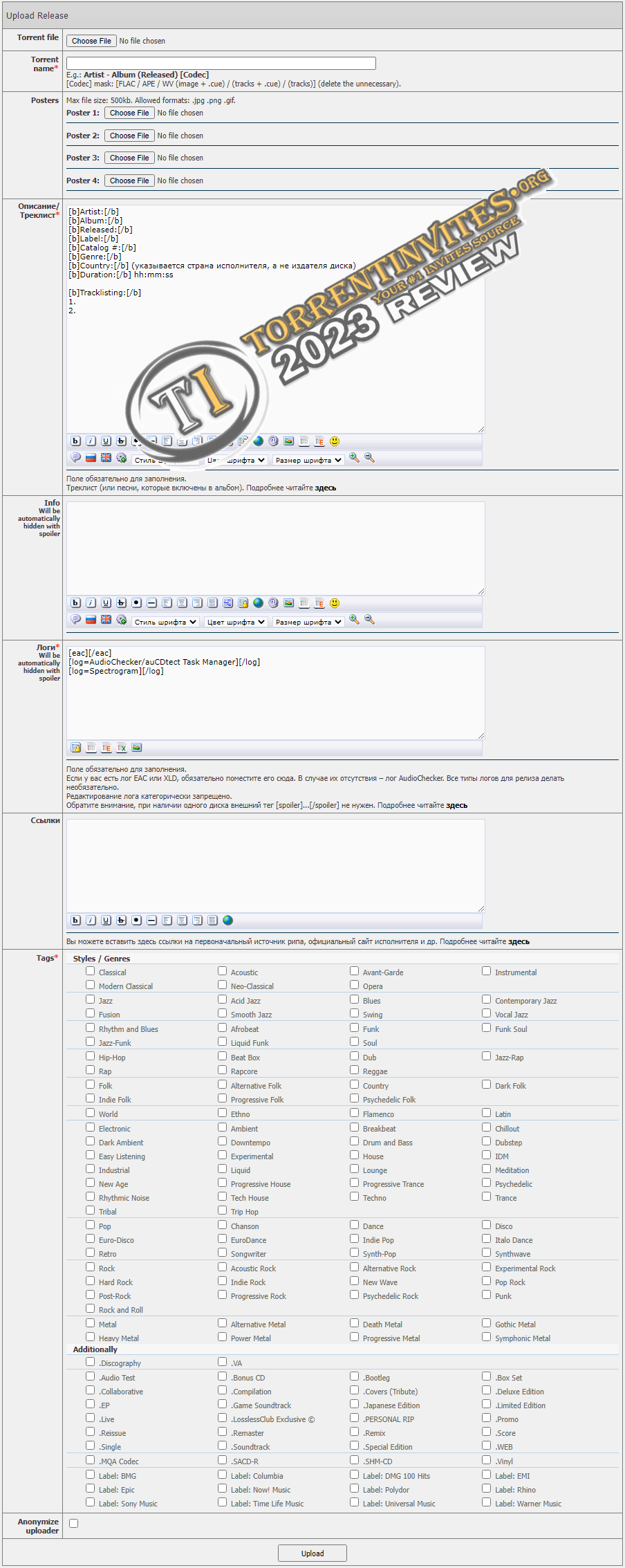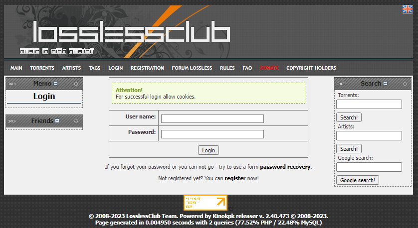 LosslessClub is a private tracker for Music specialized in lossless music but they also have some DVD and HDTV formats. All the tracker is in Russian. It has also English, Ukrainian and Bulgarian interface which you can switch between these languages. Their upload speeds are quite good.