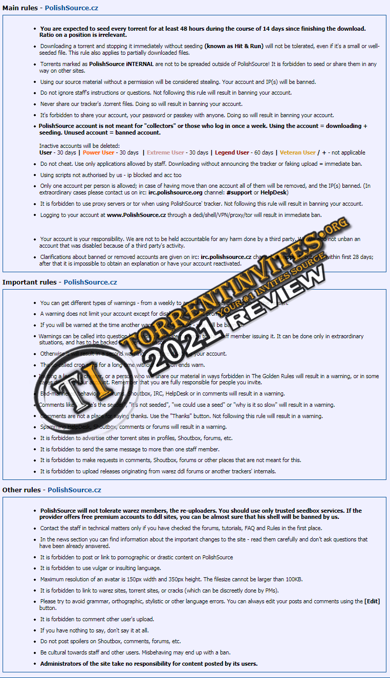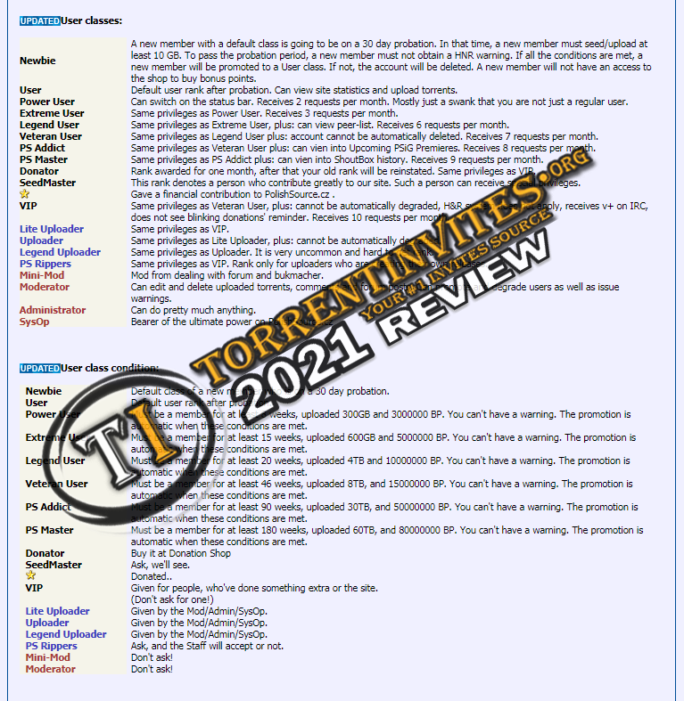 seed or share them in any way on other sites. They has a 2 day seeding requirements to avoid Hit-n-Run. Invitation can be obtained only by donating. They also have a IPTV (PSiG TV) for donators. Any level of user can upload.