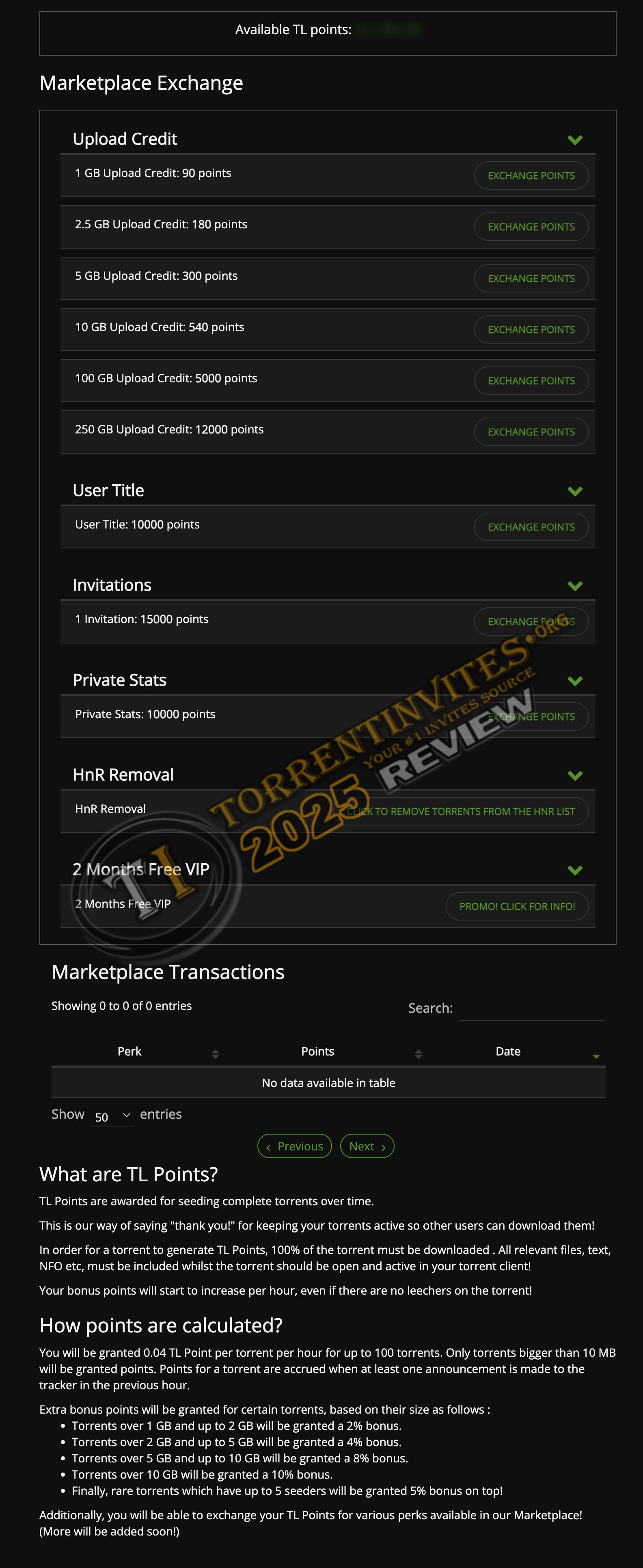 Bonus points (TL points) are awarded for seeding completed torrents over time and will be used to buy goodies from the marketplace