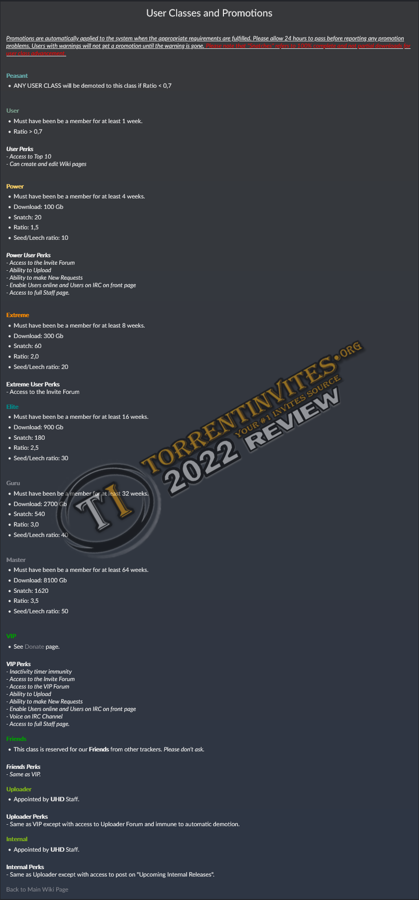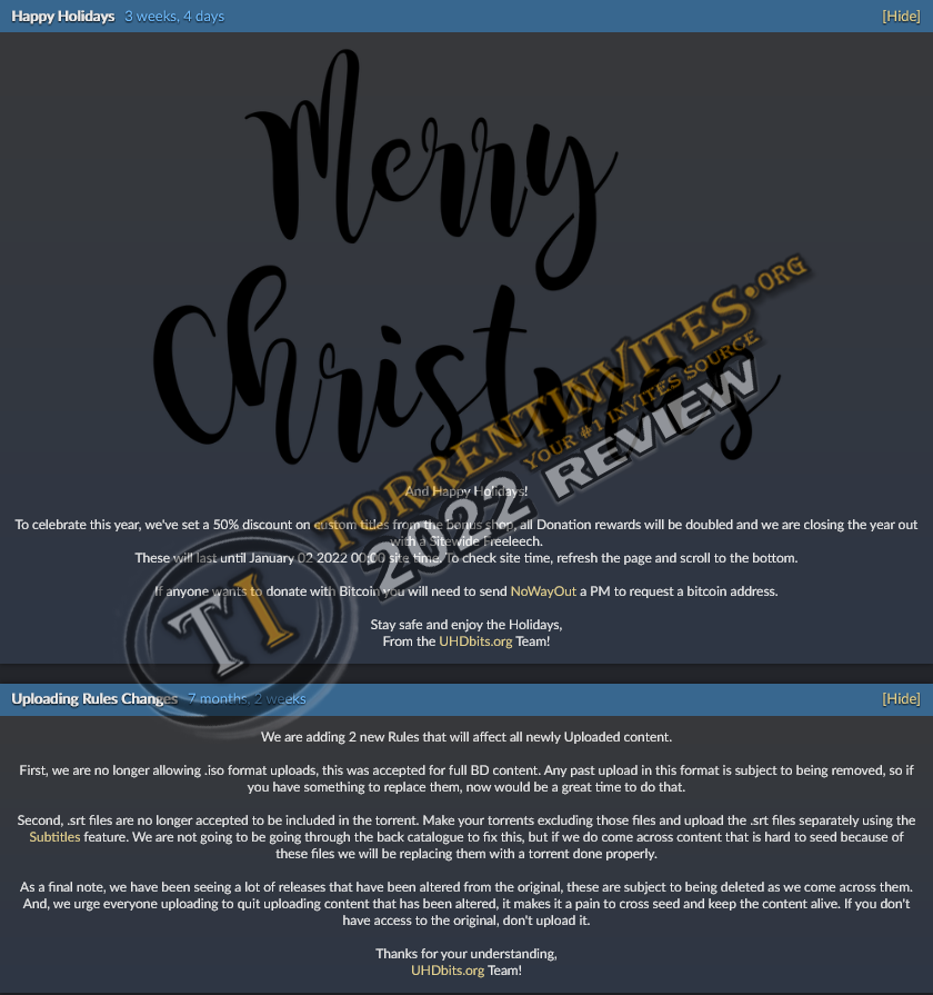 https://uhdbits.org Tracker Genre : HD / UHD Tracker Type : Ratio Based Tracker Signup : Invite Only Maintaining Ratio : Easy / Medium Bonus System : Yes Banned Countries : None Tracker IRC : Server: irc.p2p-network.net:6667 SSL +6697,+7000