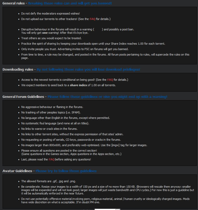 FSC is one of the best community based trackers. It differentiates itself from most trackers by trying to return the focus to the two most important things which brings us all together, which are having fun and sharing with our friends. Although the tracker is pretty decent, most members will agree that the real appeal of FSC lies within its incredible community, which is very active in the forums. The site prides itself on the fact that no user has ever been banned due to bad ratio, and that every user with a bad ratio got plenty of chances to fix his/her ratio, which probably came along with advice from staff on how to achieve this goal. FSC also has a unique ratio system, which is called a Share Index, which takes into account the user's will to share, rather than focus only on normal upload/download ratio.