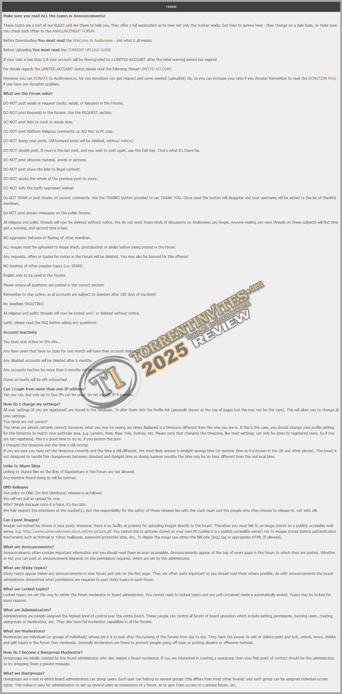 If your ratio is less than 0.8 your account will be downgraded to a LIMITED ACCOUNT after the initial warning period has expired,all accounts are subject to deletion after 180 days of inactivity!.Getting an invite requires being a member for 30 days or more, have uploaded 10GB or more, and have a ratio equals to or more than 0.8,they are issued automatically