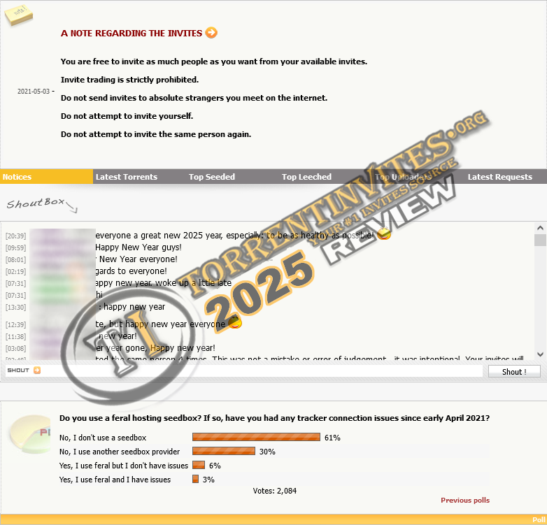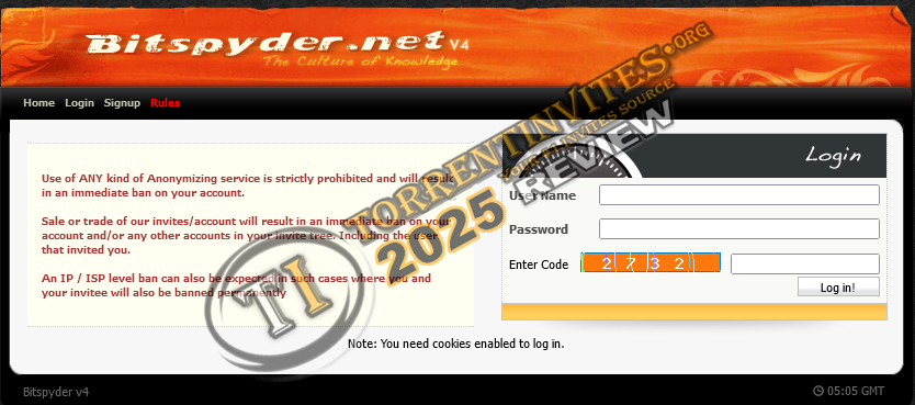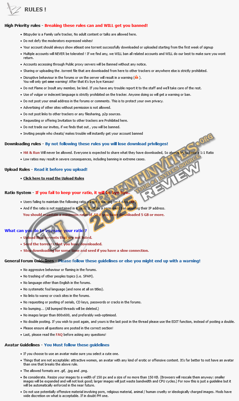 Members can make use of the shoutbox located on the homepage or their IRC channel. Bitspyder does have a forums section but this seems to be very quiet and rarely used. All members are required to seed back anything they download to a 1:1 ratio, members with a low ratio will receive a warning for six days before their account is disabled and IP is banned if no improvement has been made.
