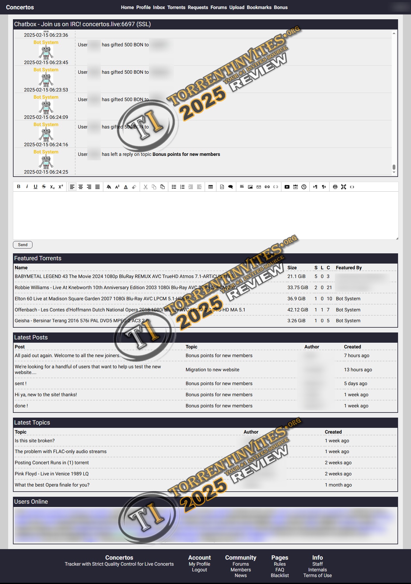 Seedtime is 7 days regardless of ratio. Maintaining ratio is easy. You'll find some freeleech torrents here. There is a bonus point system available. Which you can exchange with Upload, Personal Freeleech, Invite and other things like Gifts & Request. Speaking of requests, there is an active request section, where you can ask for specific performed content if you want. Overall it's a nice tracker to have if you are into music videos and Live concert content.