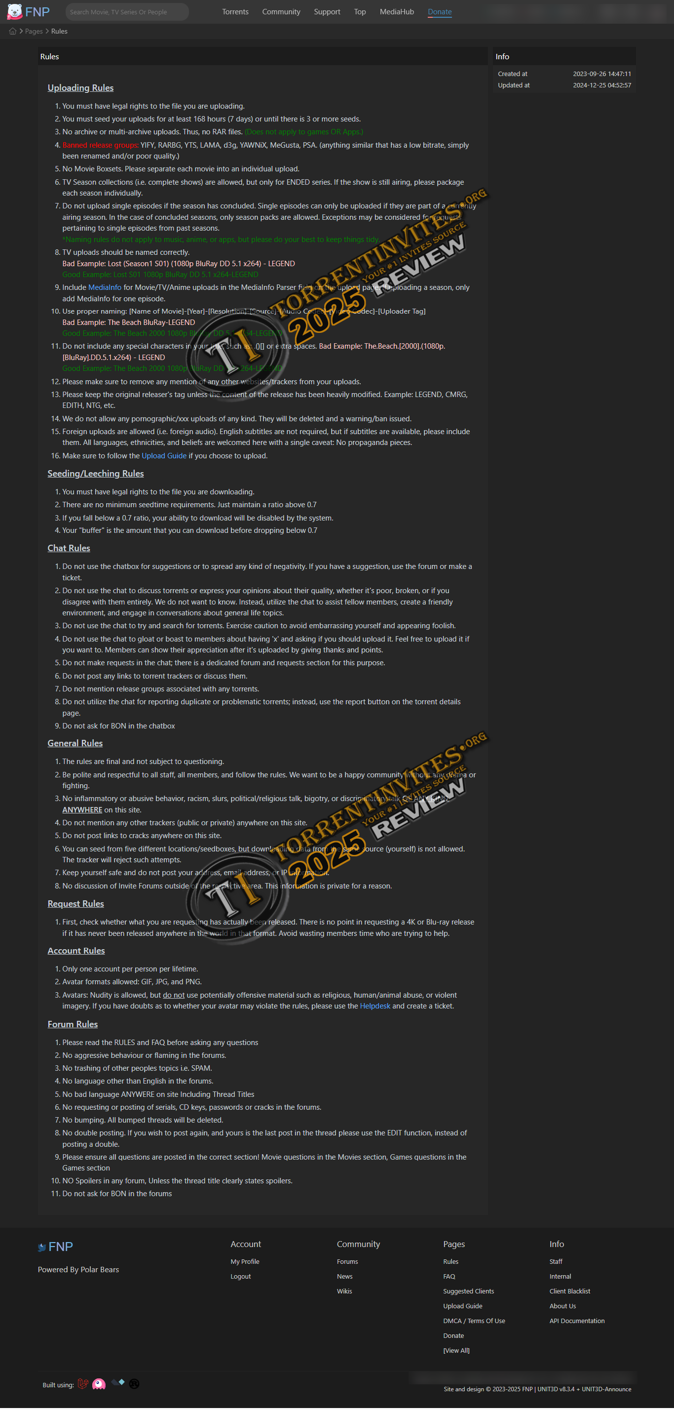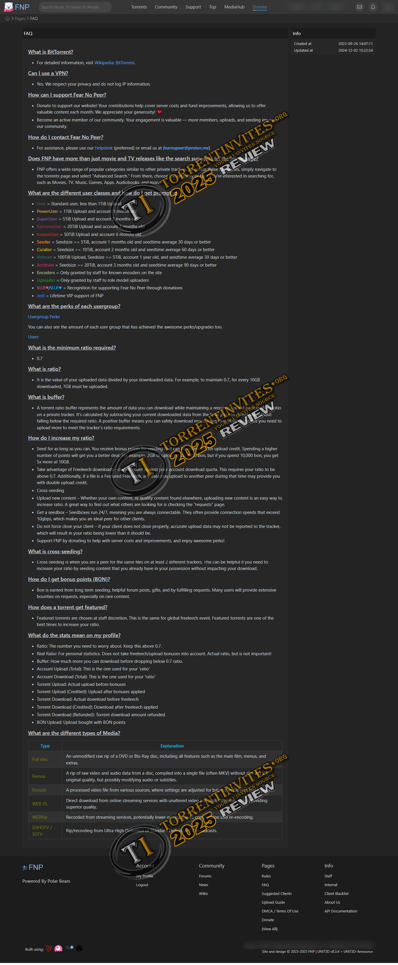 Heading InformationTracker Name FearNoPeer Tracker Acronyms FNP Tracker URL https://fearnopeer.com/ Tracker Genre General Tracker Type Ratio Besed Mantaining Ratio Easy Seedbonus Available Joining Method Invite Only Tracker Age 2 Years Site UI Language English Codebase Unit3D Banned Countries None Contact Info IRC