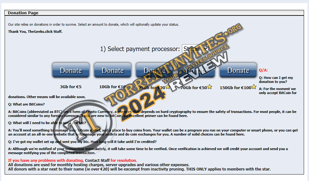 Donations are offered through Bitcoin or Stripe. Smaller donations are rewarded with a small amount of upload credit, large donations come with upload credit and a shiny 'star' next to the members name. The star makes a member immune for inactivity pruning.