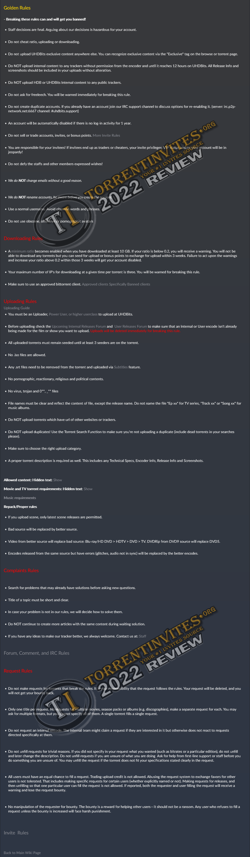https://uhdbits.org Tracker Genre : HD / UHD Tracker Type : Ratio Based Tracker Signup : Invite Only Maintaining Ratio : Easy / Medium Bonus System : Yes Banned Countries : None Tracker IRC : Server: irc.p2p-network.net:6667 SSL +6697,+7000