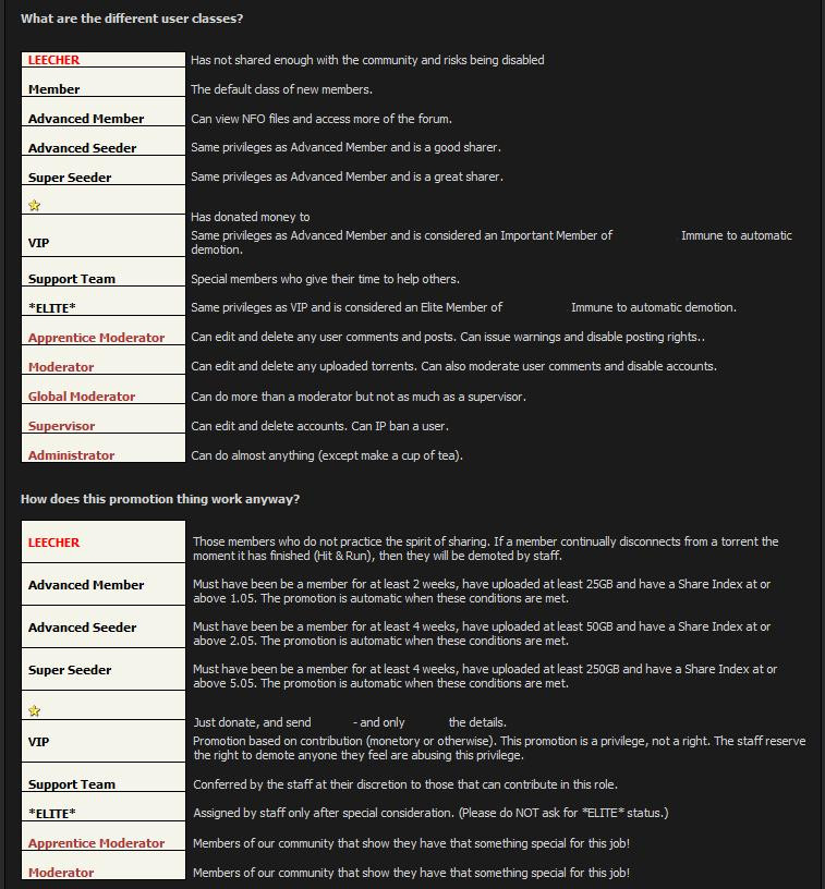 FSC is one of the best community based trackers. It differentiates itself from most trackers by trying to return the focus to the two most important things which brings us all together, which are having fun and sharing with our friends. Although the tracker is pretty decent, most members will agree that the real appeal of FSC lies within its incredible community, which is very active in the forums. The site prides itself on the fact that no user has ever been banned due to bad ratio, and that every user with a bad ratio got plenty of chances to fix his/her ratio, which probably came along with advice from staff on how to achieve this goal. FSC also has a unique ratio system, which is called a Share Index, which takes into account the user's will to share, rather than focus only on normal upload/download ratio.
